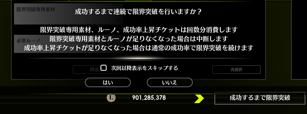 | 必要限界突破専用素材 | 1 | 2 | 2 | 3 | 3 | 11 (失敗でも消失) | 1 |